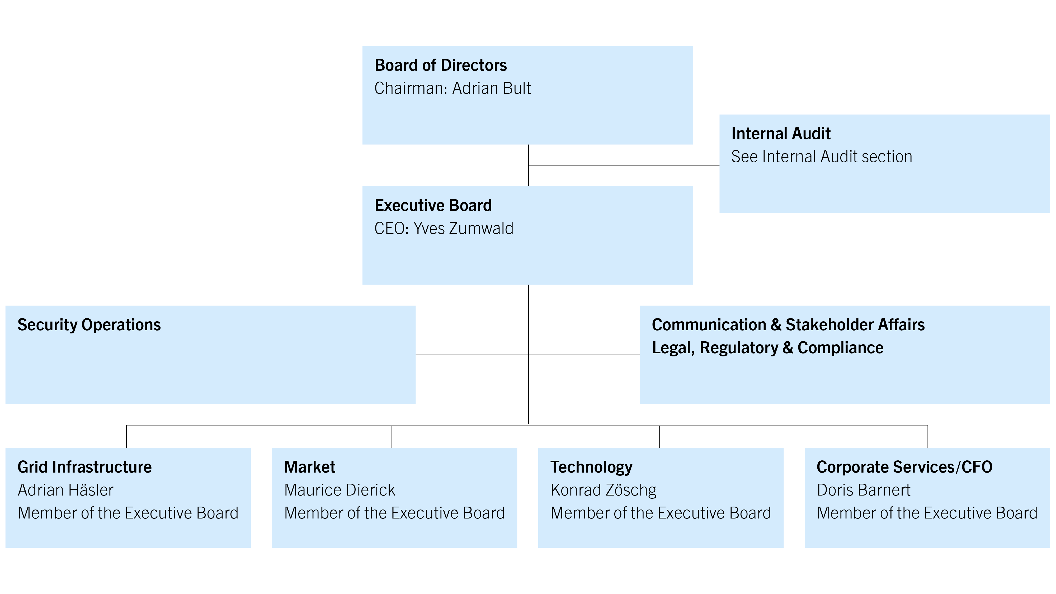 – At every ordinary Board meeting, the CEO submits a written report on business operations that addresses subjects such as grid operations, ancillary services, grid construction projects, relevant developments in Switzerland and Europe, and key performance indicators (KPI).