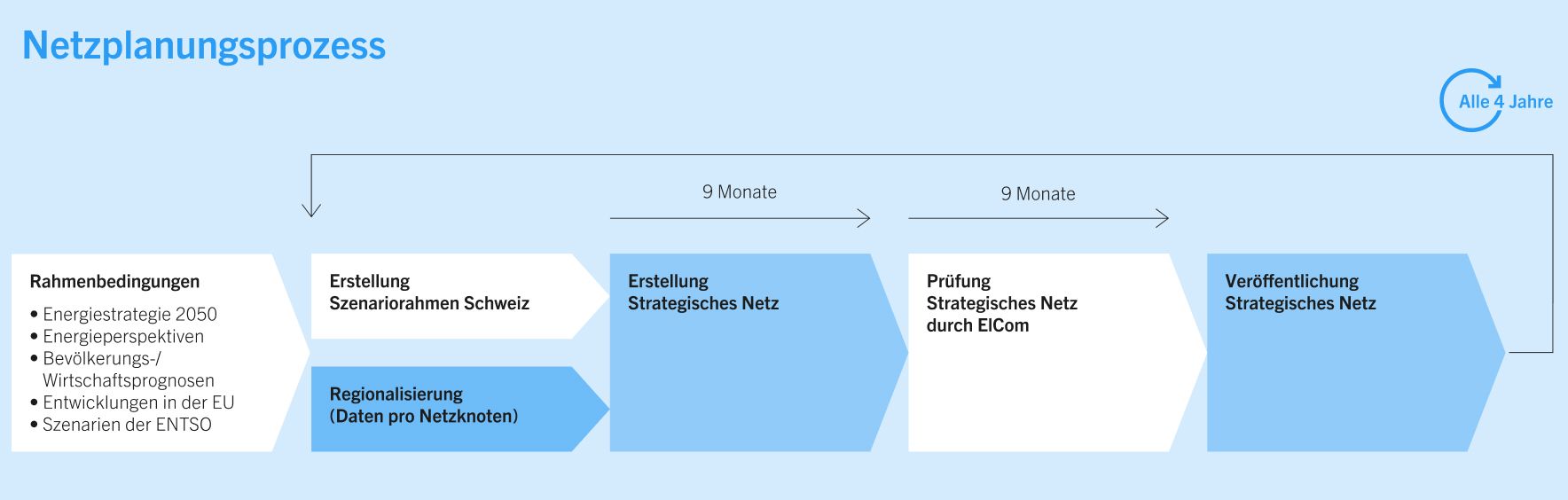 Auf Basis dieses Szenariorahmens erarbeitet Swissgrid das Strategische Netz 2040. Zusätzlich erhält Swissgrid von den SBB sowie den Verteilnetz- und Kraftwerksbetreibern, die direkt am Übertragungsnetz angeschlossen sind, Informationen zur regionalen Entwicklung von Produktion und Verbrauch innerhalb der Schweiz. Unter Berücksichtigung dieser Daten ermittelt Swissgrid den Netzentwicklungsbedarf.
