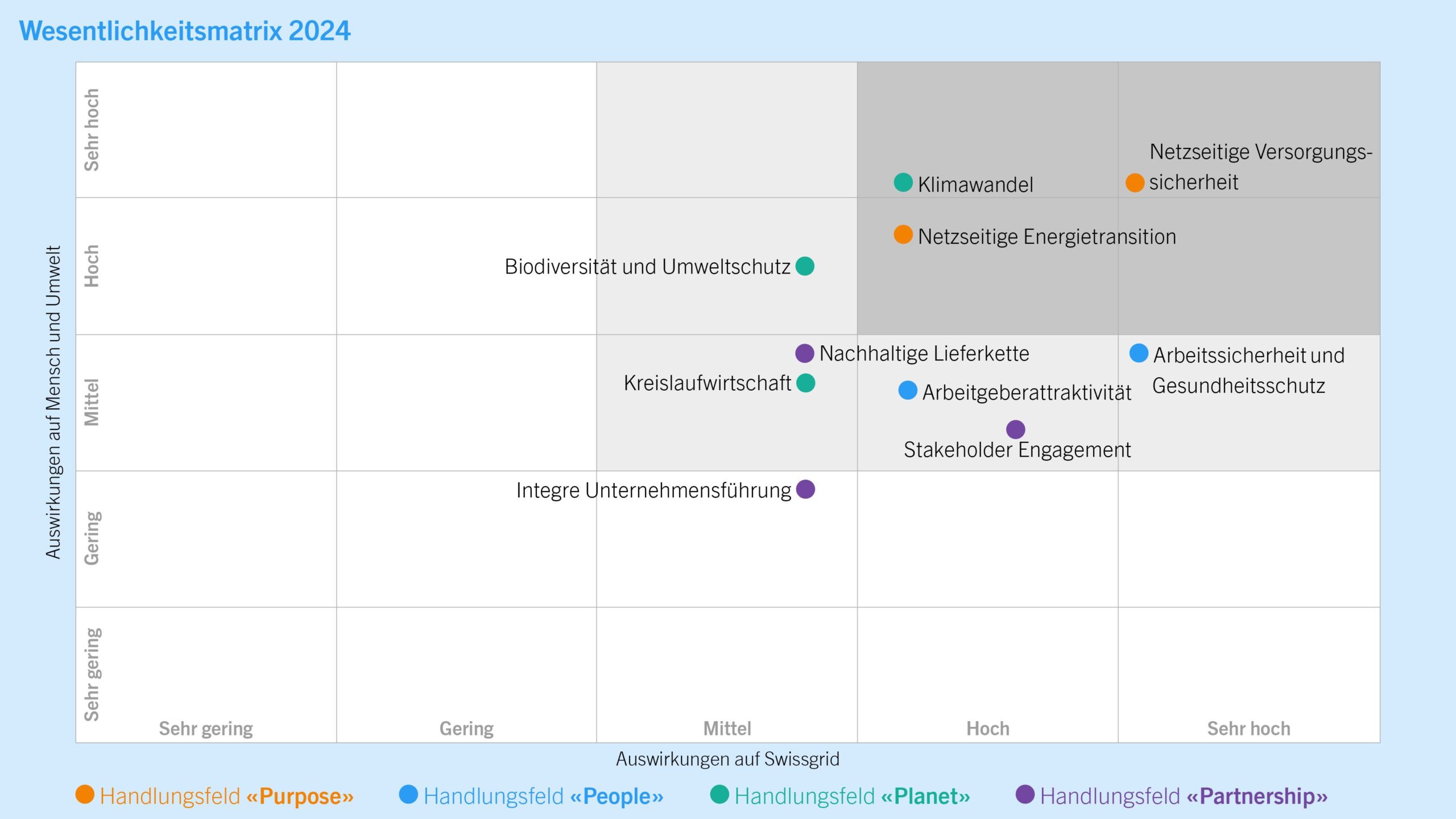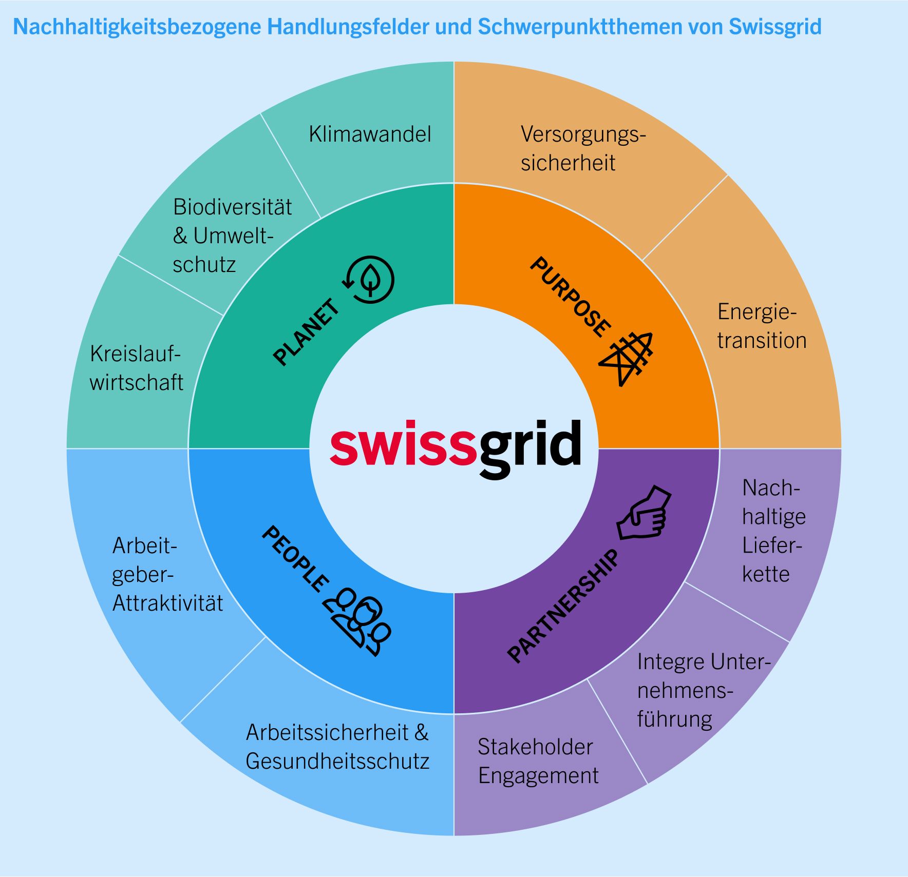 Der Verwaltungsrat von Swissgrid hat die nachhaltige Ausrichtung des Unternehmens als strategische Stossrichtung «Corporate Social & Environmental Responsibility» (CSER) in der Strategie 2027 verankert. Ziel der CSER-Stossrichtung ist, dass Swissgrid ihre gesellschaftliche Verantwortung für Mensch und Umwelt wahrnimmt, indem nachhaltiges Handeln bei allen Tätigkeiten und in allen Bereichen des Unternehmens aktiv und selbstverständlich gelebt wird. Ihr Nachhaltigkeitsengagement gliedert Swissgrid in die vier strategischen Handlungsfelder Purpose, Planet, People und Partnership. Im Januar 2025 hat der Verwaltungsrat zehn Schwerpunkte entlang dieser vier strategischen Handlungsfelder mittels der aktualisierten doppelten Wesentlichkeitsanalyse festgelegt. Die Schwerpunktthemen bilden die Basis für die strategische CSER-Ausrichtung und die nichtfinanzielle Berichterstattung.