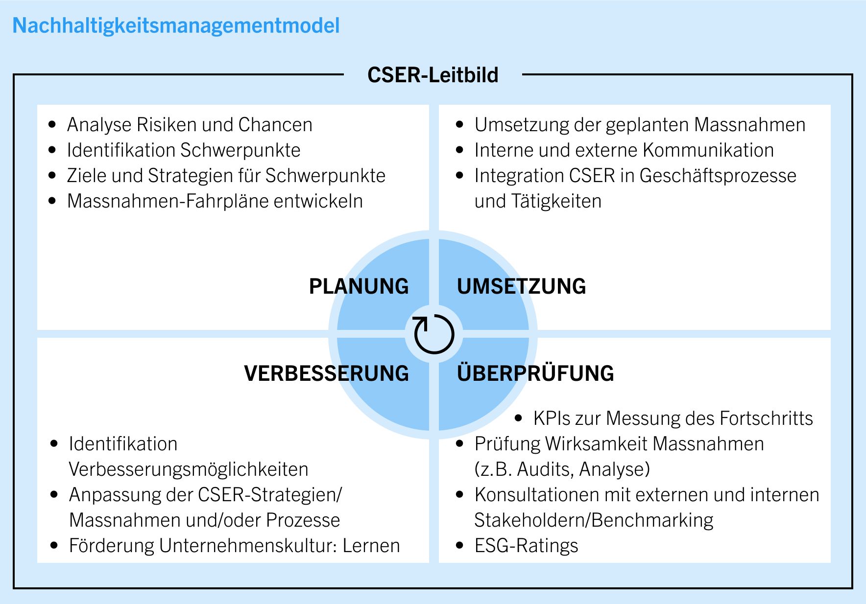 Die Zuordnung der operativen Verantwortlichkeiten im Bereich Nachhaltigkeit orientiert sich am Drei-Linien-Governance-Modell. Dieses Modell dient als Ordnungsrahmen, um Nachhaltigkeitsbelange systematisch zu bewirtschaften und bei der Entscheidungsfindung zu berücksichtigen, die Kontrolle risikobehafteter Aufgabenbereiche sicherzustellen, die Einhaltung gesetzlicher und interner Vorschriften zu überprüfen, die strategische Weiterentwicklung voranzutreiben und Fehler oder Unregelmässigkeiten zu identifizieren, zu beheben und daraus zu lernen. Eine der Governance-Domänen der zweiten Linie ist die Nachhaltigkeit.