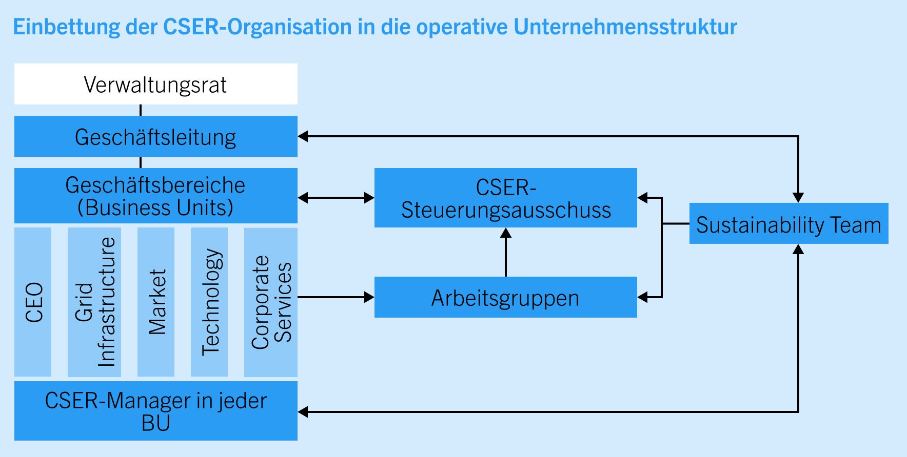 Die Geschäftsleitung von Swissgrid hat im Oktober 2023 ein dediziertes Team «Sustainability» geschaffen, das direkt an die CFO und Head of Corporate Services von Swissgrid rapportiert. Im Geschäftsjahr 2024 hat die Geschäftsleitung zudem folgende CSER-Organisationen genehmigt mit dem Ziel, das bereichsübergreifende Management und die Verankerung von Nachhaltigkeit in allen Geschäftsbereichen voranzutreiben: