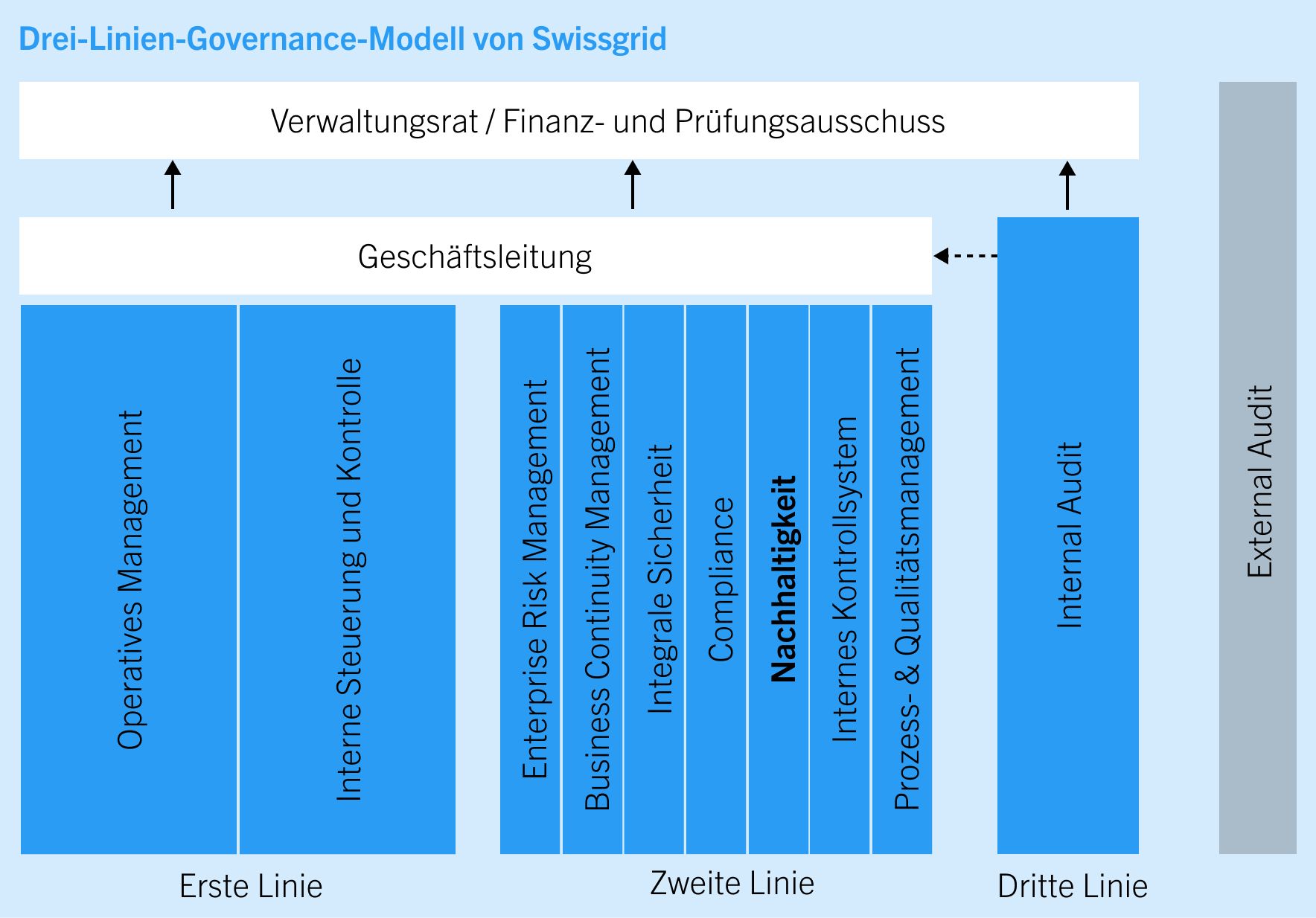 Weitere Governance-Domänen der zweiten Linie mit Relevanz für Nachhaltigkeitsbelange sind das ERM, Compliance sowie die Integrale Sicherheit. Diese Domänen unterstützen den Verwaltungsrat und die Geschäftsleitung mittels wirksamer Managementsysteme, potenzielle Auswirkungen und Risiken zu mitigieren und zu steuern, die Einhaltung des geltenden Rechtsrahmens und der ethischen Grundsätze sicherzustellen und Personen, Anlagen, Systeme und Informationen von Swissgrid gegen Beeinträchtigungen zu schützen.