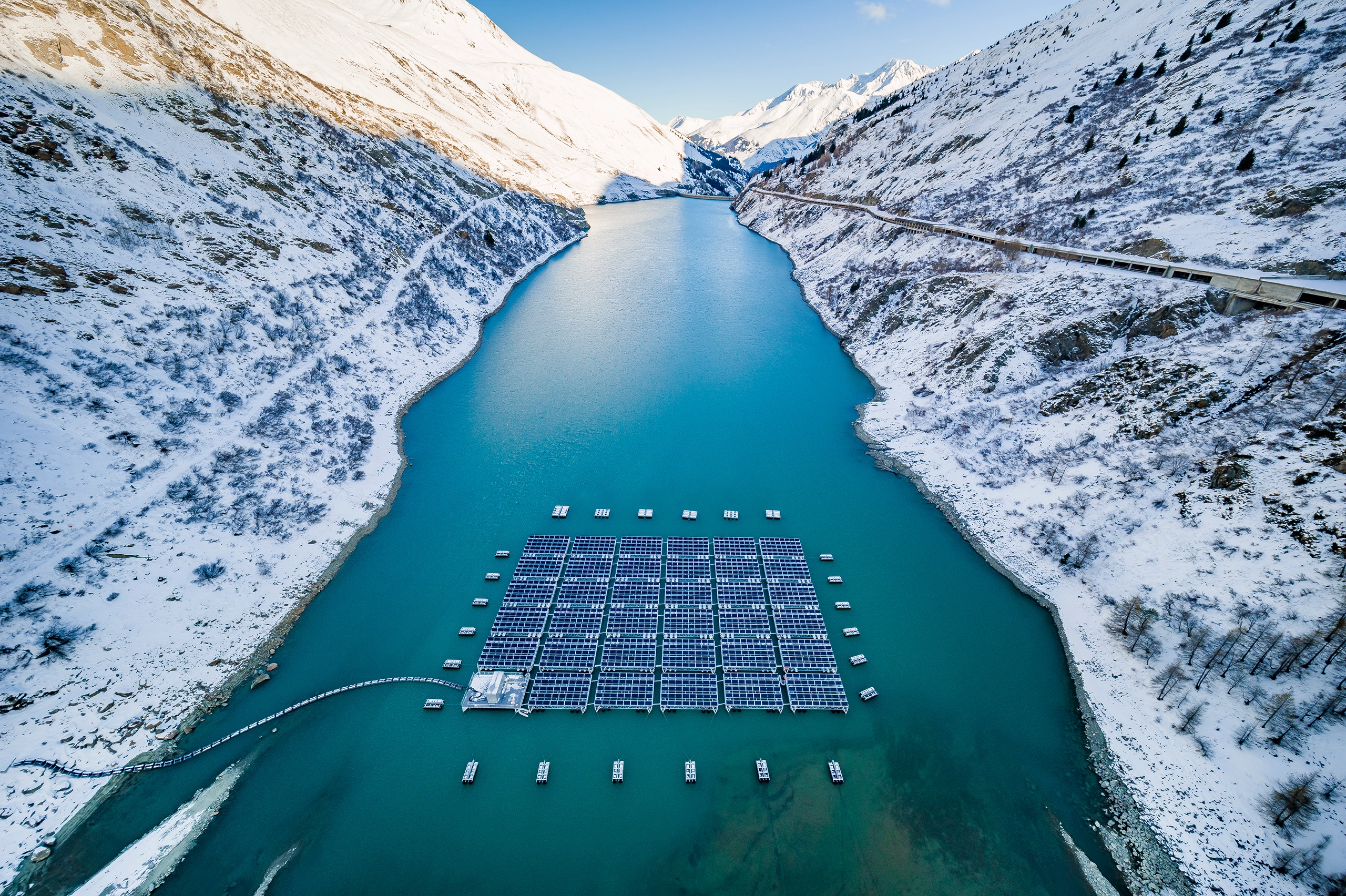 Source : Romand Energie. Installation solaire flottante sur le lac des Toules, dans la commune valaisanne de Bourg-Saint-Pierre.